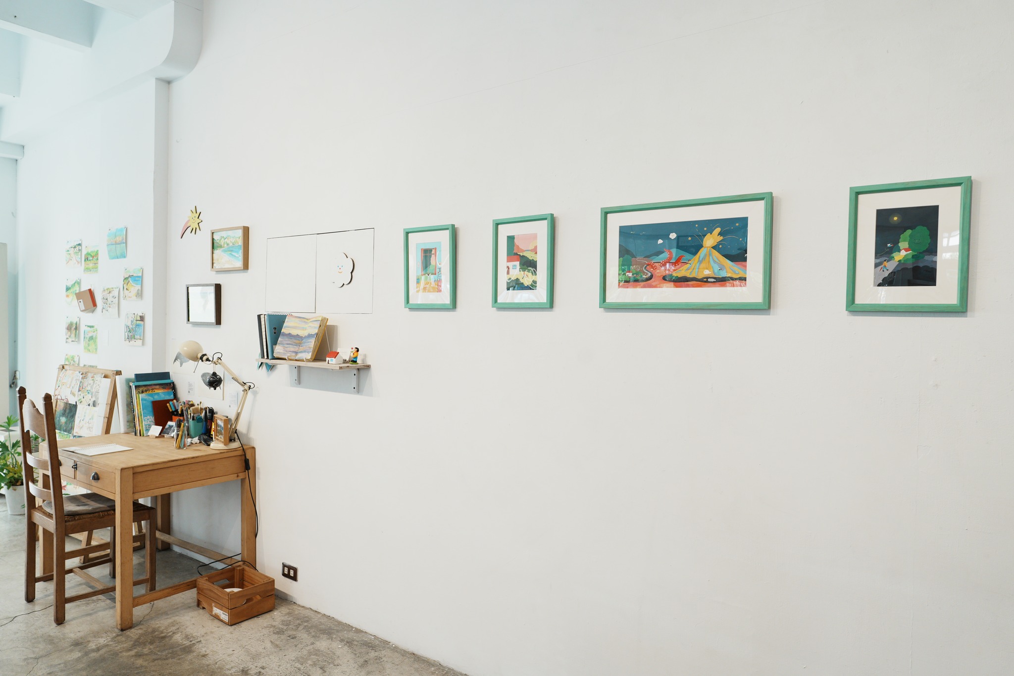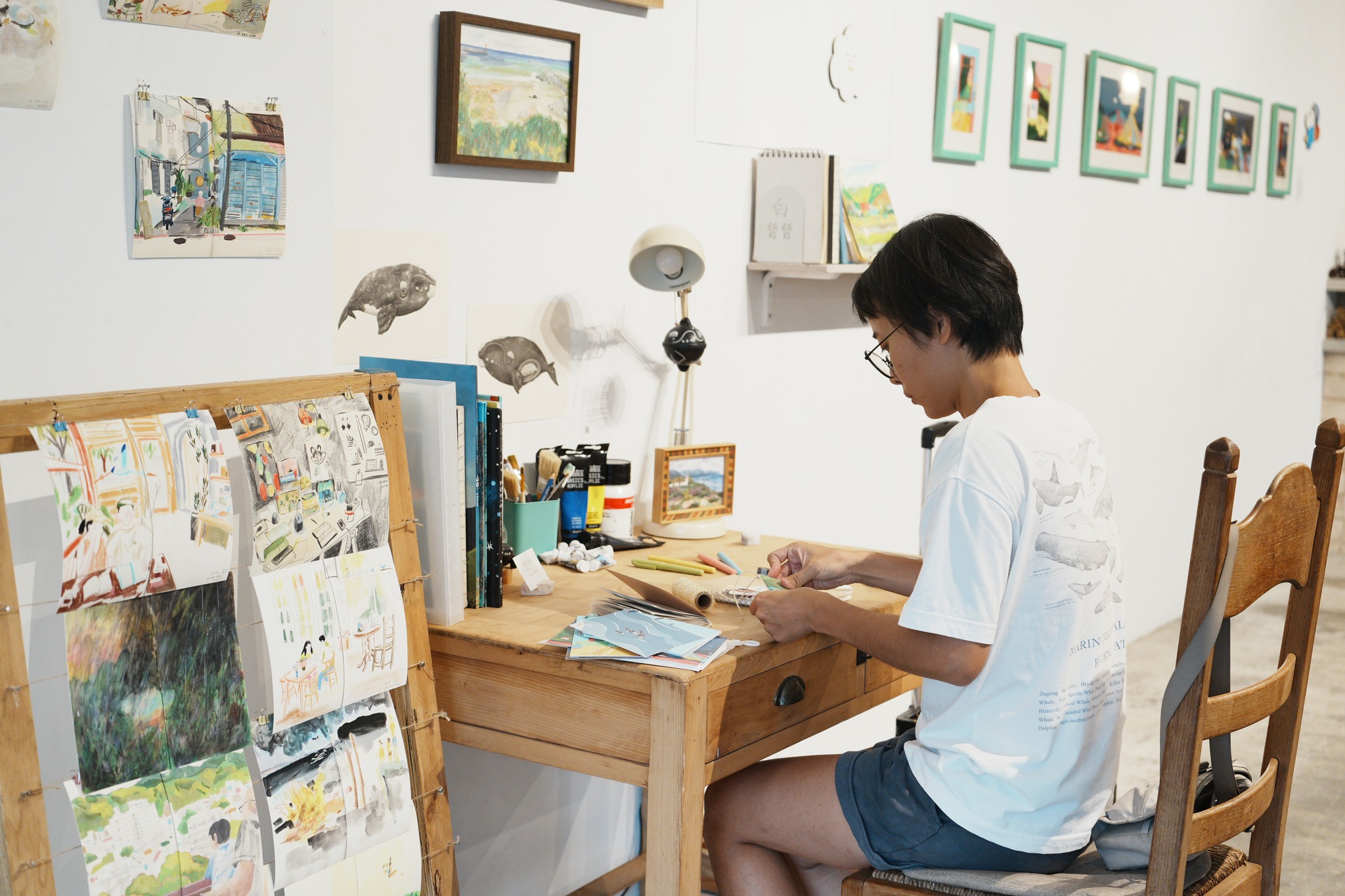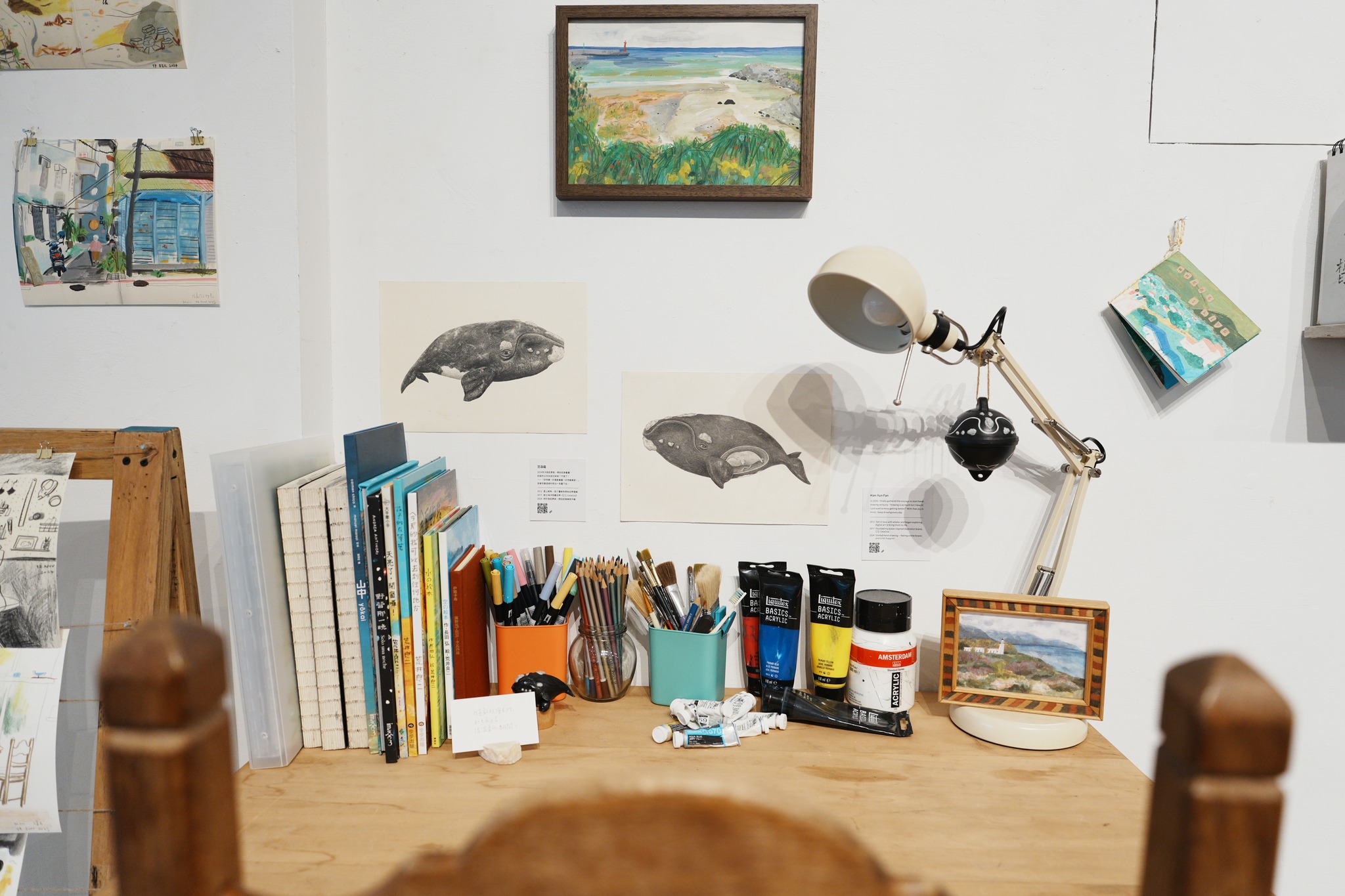 展架旁的桌面,擺滿了畫具、顏料、和超級精彩的速寫本(有她練習筆觸和顏色的軌跡,ㄈㄈ 迷必翻!!!)、手工小書、陪她畫畫的鯨魚小物..
