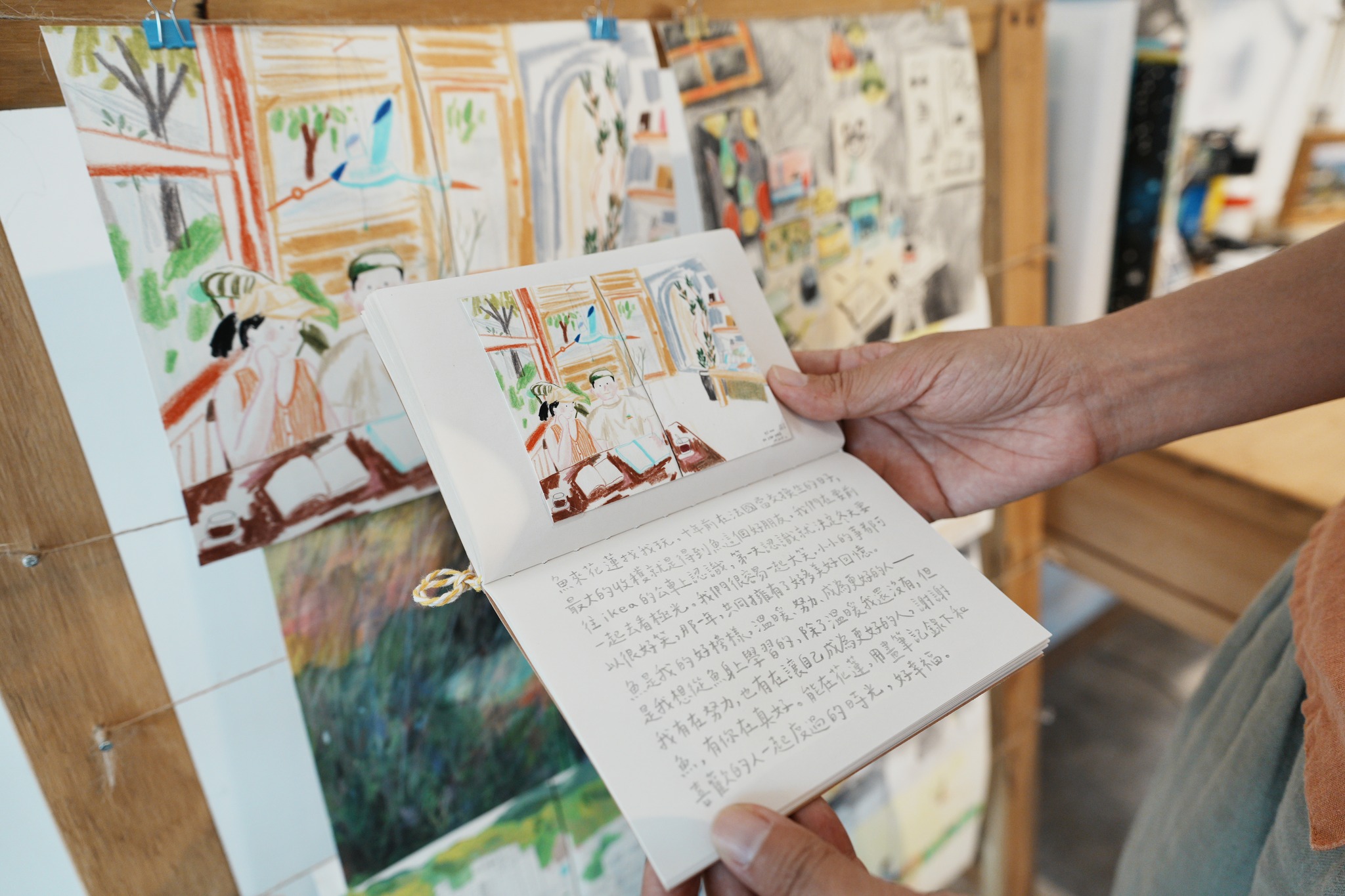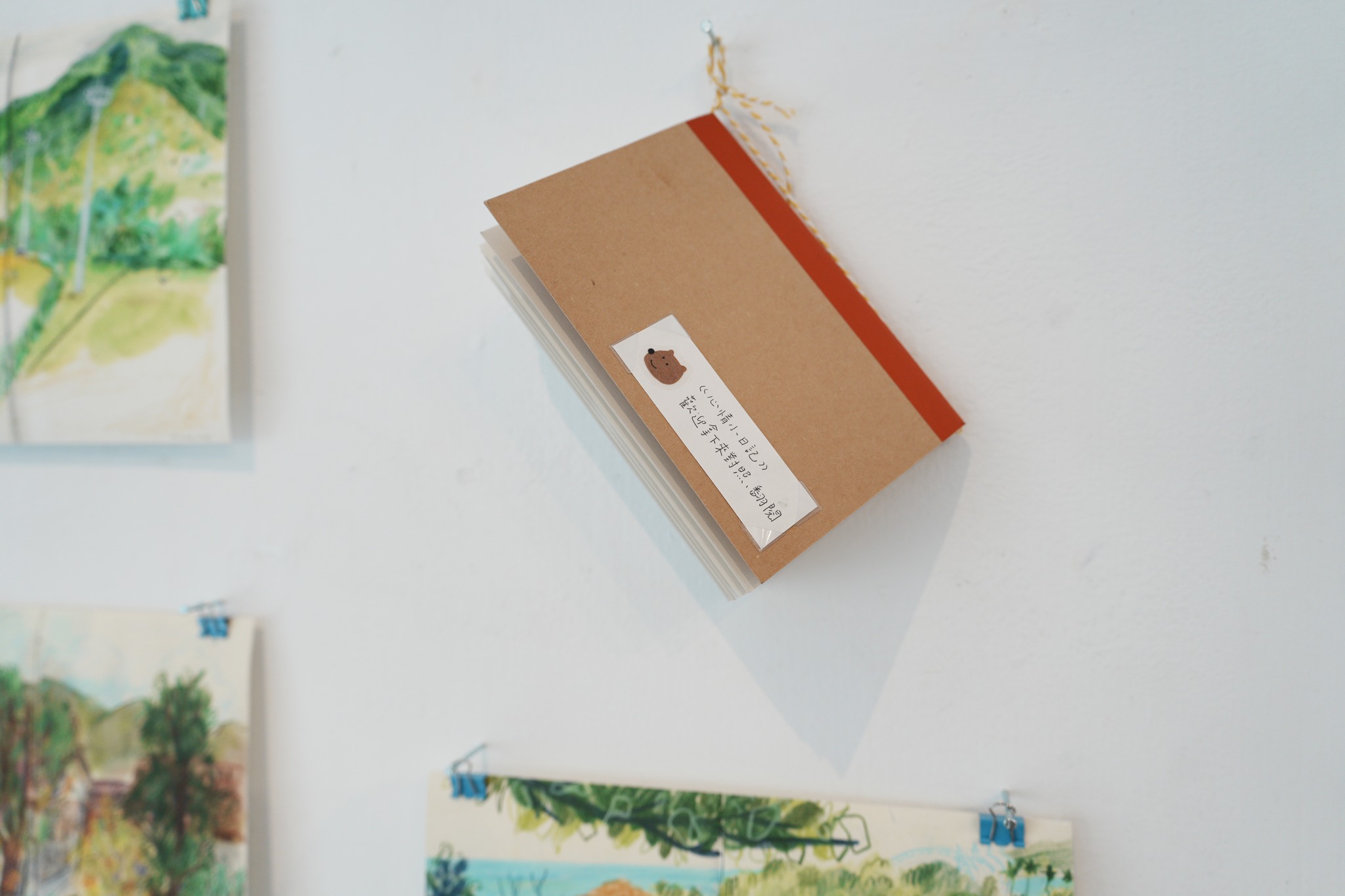 不是中英對照。。。但可以在現場找一張喜歡的圖,拿出牆上懸掛的小本子按圖索驥,裡面一字一句,都是畫畫當下的情境與可愛內心話。