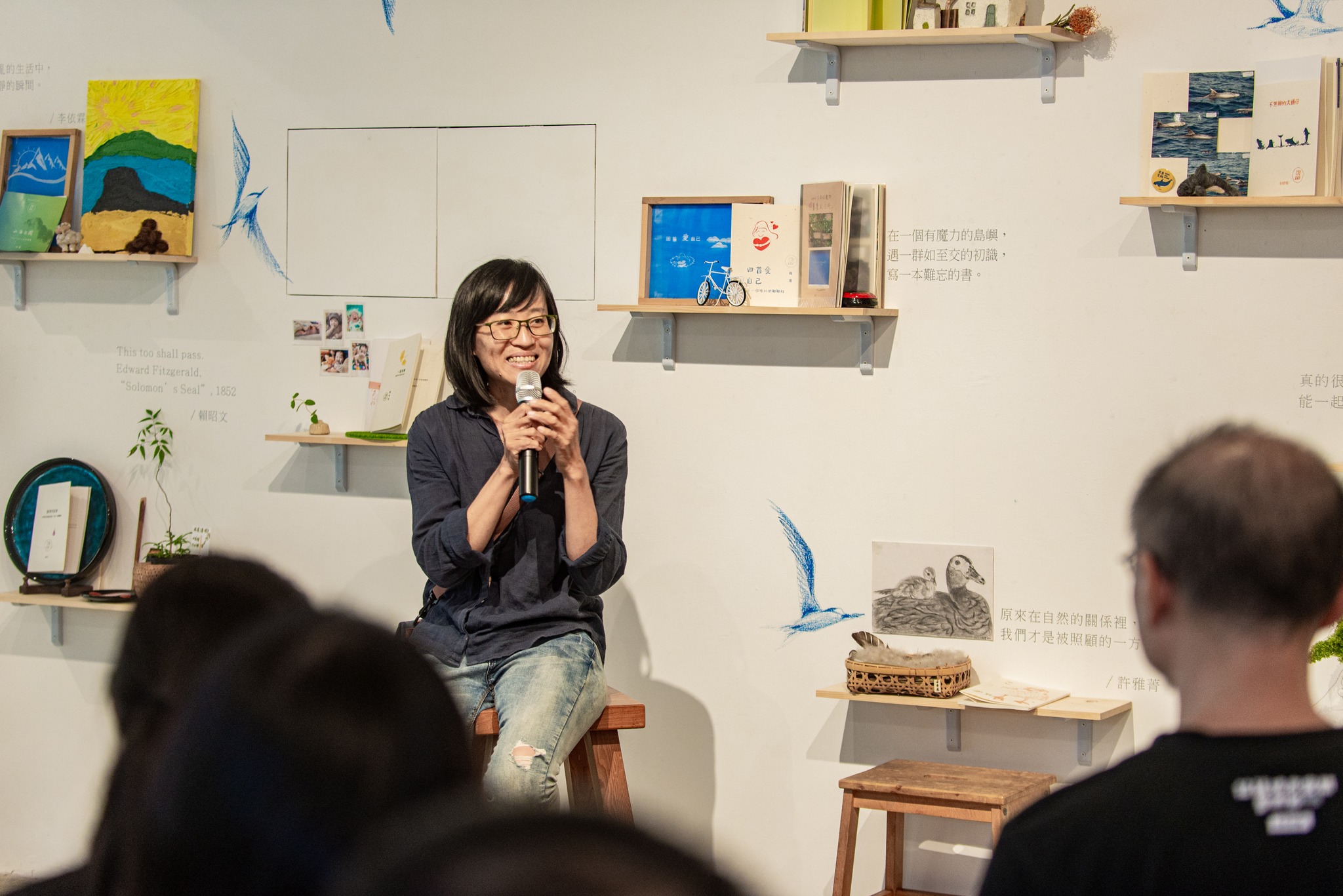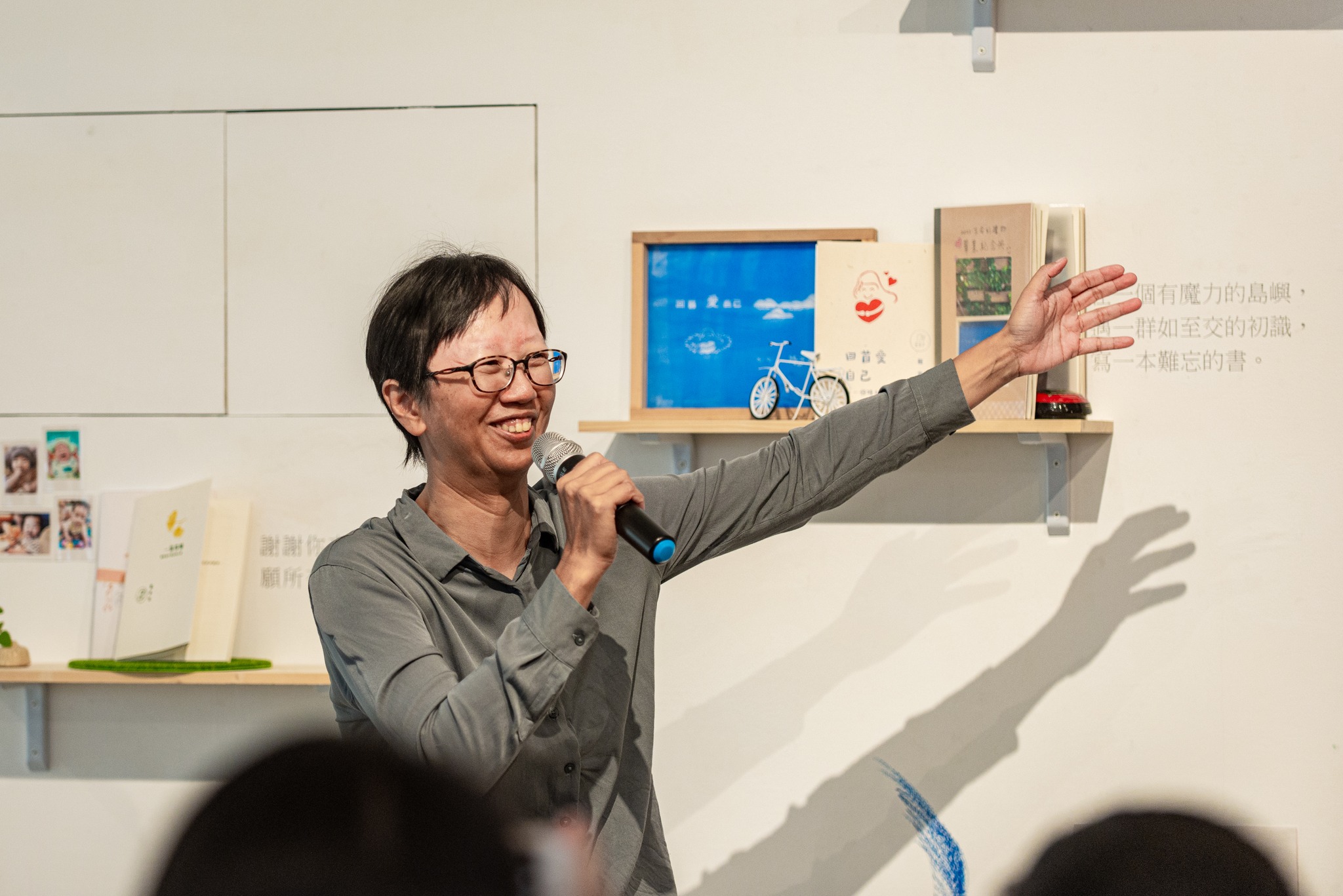 要以短短時間介紹長時間醞釀的作品並不容易,但當大家站上台逐一分享時,每個人都有一首搭配作品的歌,來自同學Jerry精心挑選。這些音樂像魔術一樣調控著現場的氣氛,跨度之廣,從管弦樂組曲、電影配樂,到搖滾樂、民歌一應俱全(放〈紅蜻蜓〉時全場騷動,Jerry形同直接以音樂召喚出眾人的青春回憶,來搭配雅芳談國三回憶的小書)